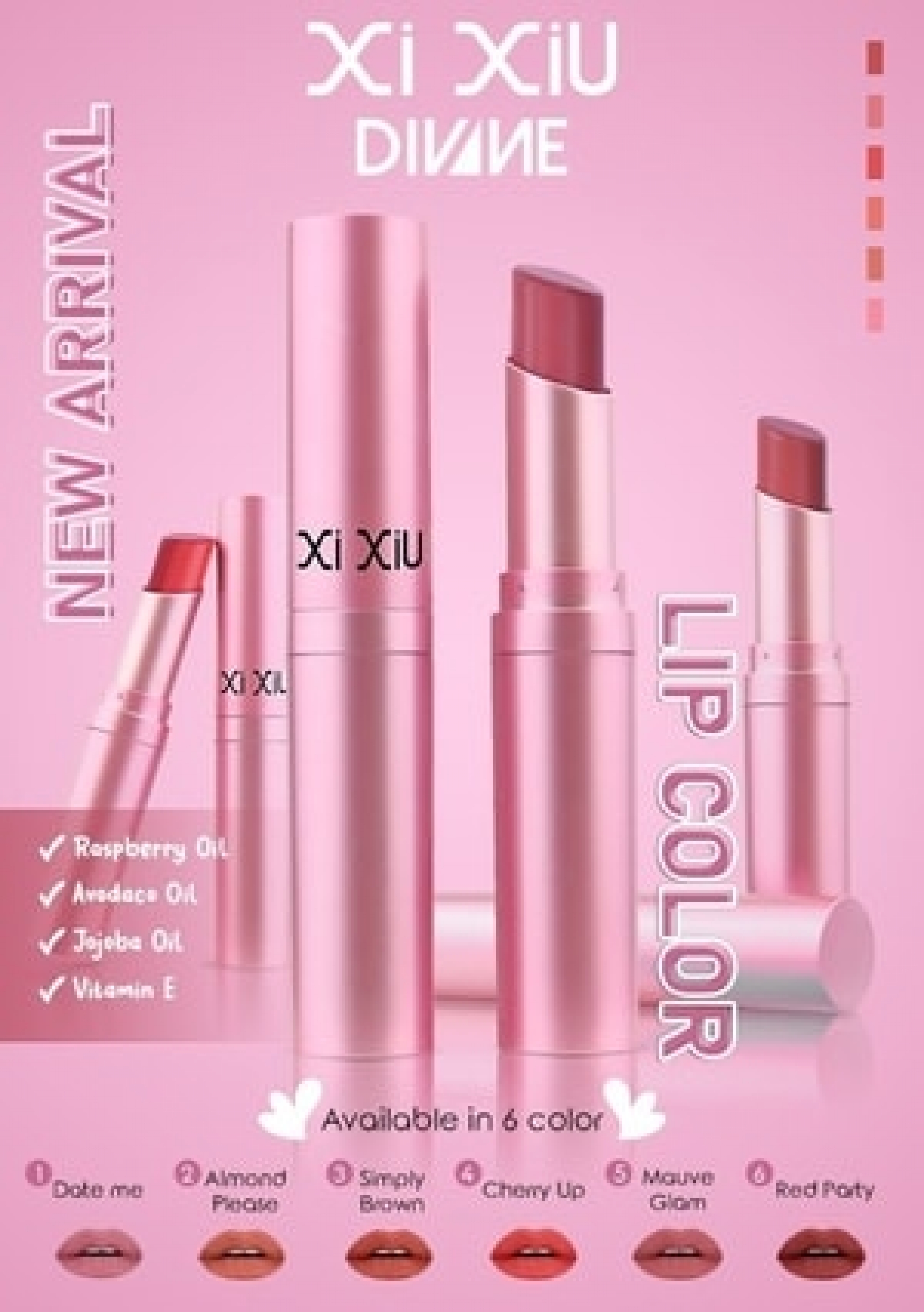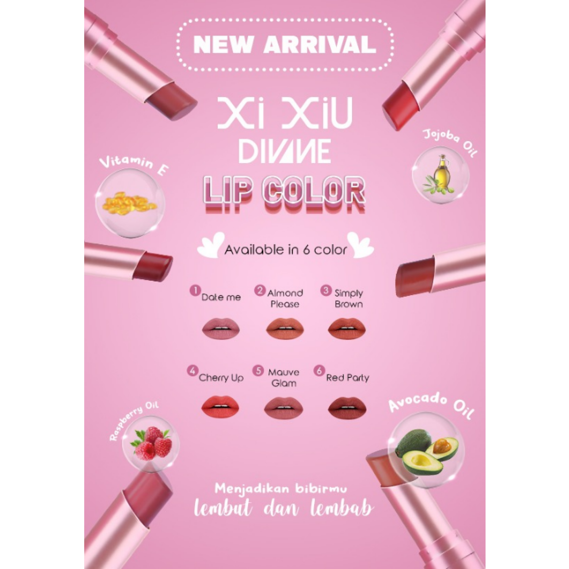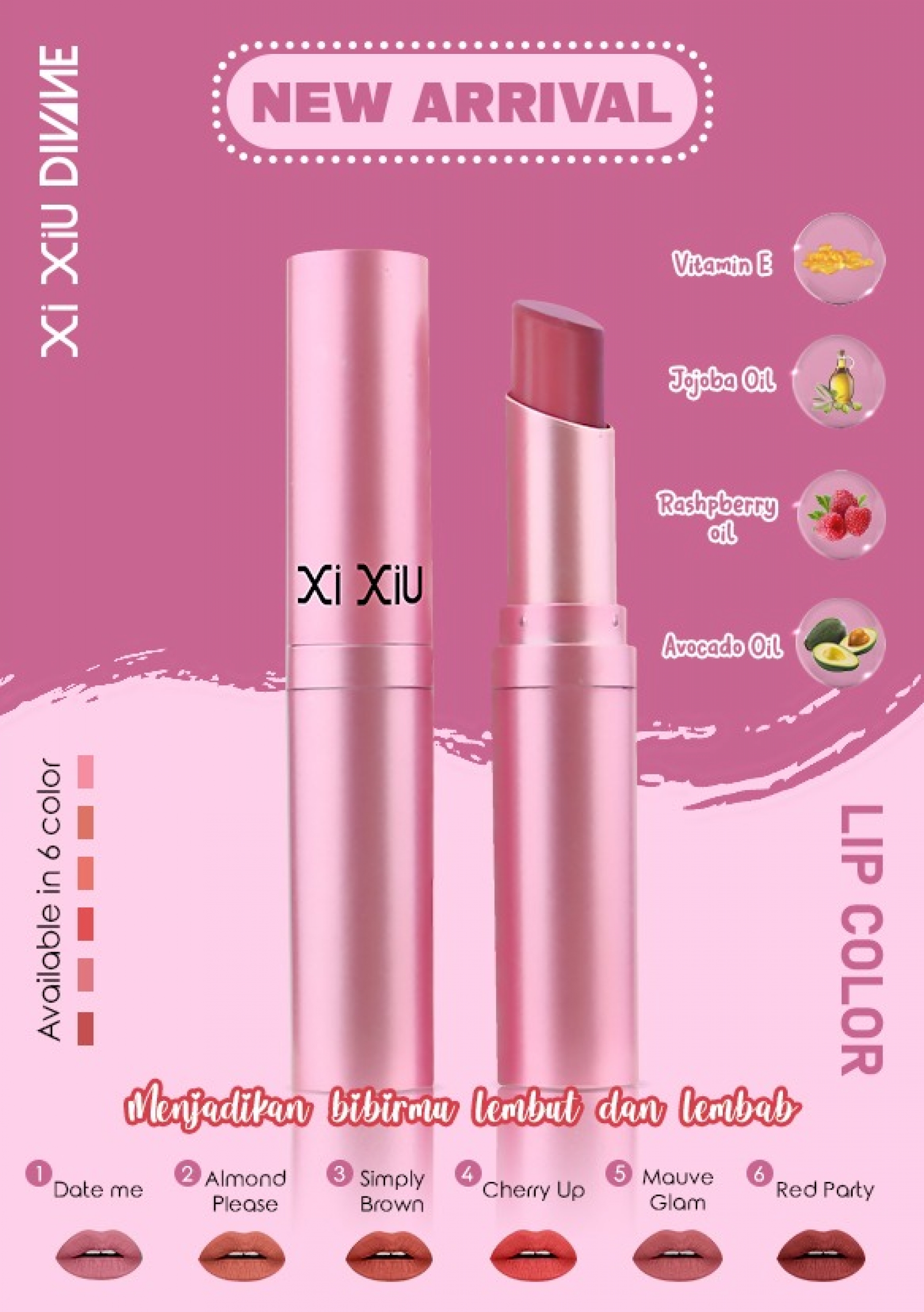 XI XIU DIVINE LIP COLOR hadir dengan 6 pilihan warna yang akan membuat bibir terlihat semakin mempesona , daya coverage tinggi dan tahan lama. Diperkaya dengan Raspberry Oil, Avocado Oil, Jojoba Oil, dan Vitamin E untuk membantu bibir terasa lebih lembut,lembab, dan mempesona.