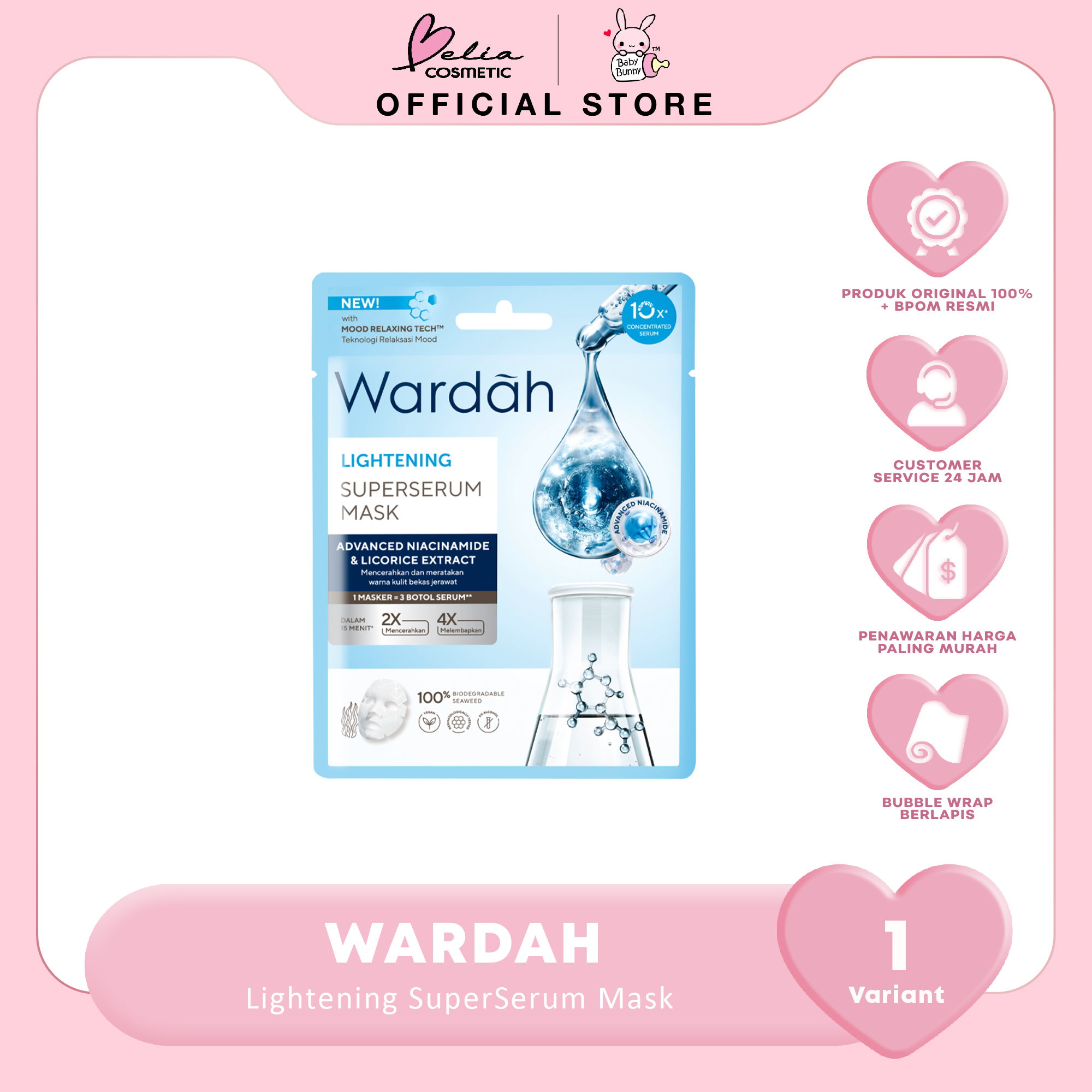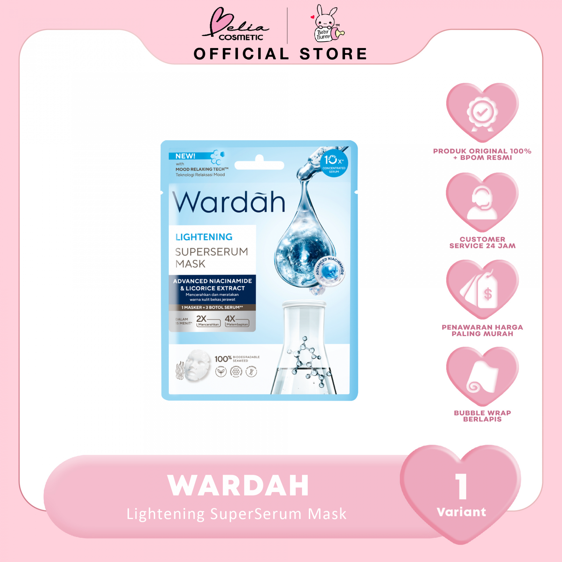 Sheet mask dengan 100% degradable seaweed yang natural mengandung essence yang diformulasikan dengan kandungan 4x Advanced Niacinamide^^ dan Licorice Extract untuk mencerahkan, melembapkan, serta menyamarkan bekas jerawat. Untuk kulit cerah, terlindungi, dan tampak sehat!