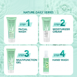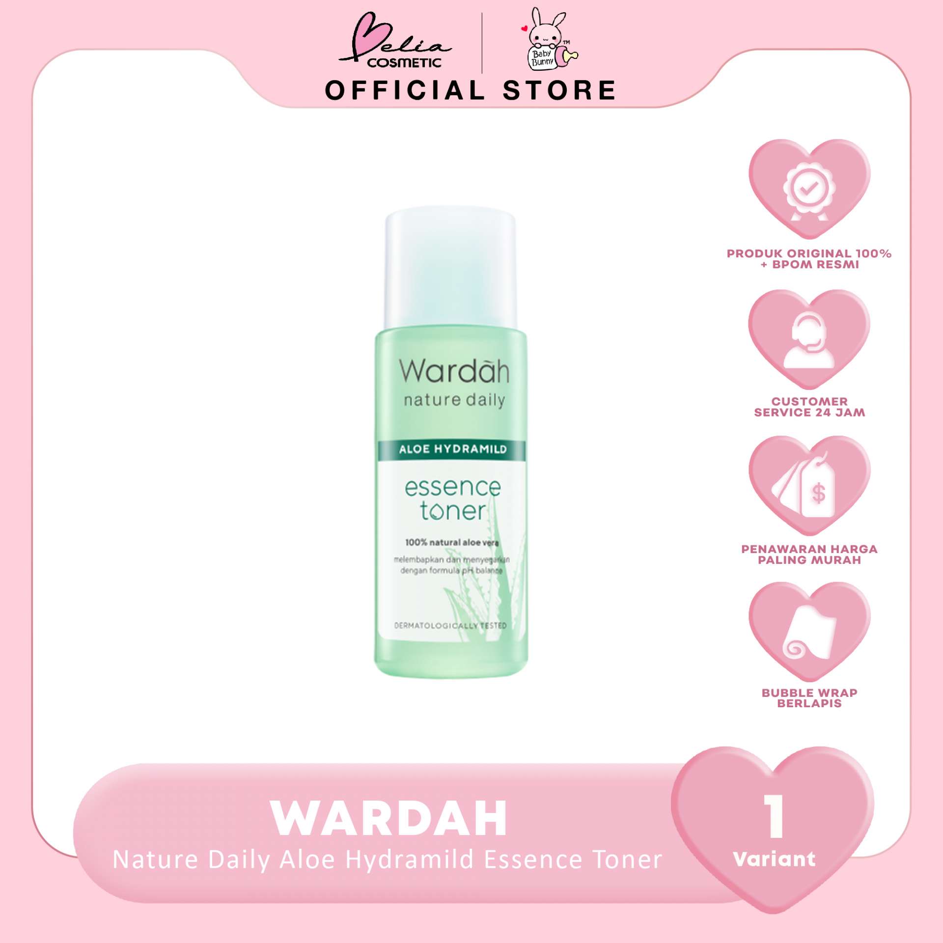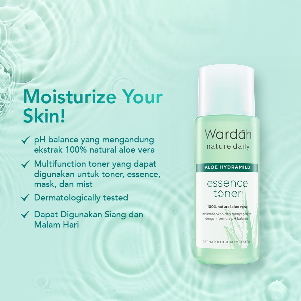 Wardah Nature Daily Aloe Hydramild Essence Toner 100 ml merupakan perpaduan essence dan toner dengan formula pH balance yang mengandung ekstrak 100% natural aloe vera untuk melembapkan dan menyegarkan kulit.