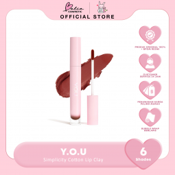 YOU Simplicity Cotton Lip Clay bertekstur powdery velvet matte diperkaya dengan Hyaluronic Acid dan Ekstrak Cocoa Butter yang tinggi antioksidan untuk membantu menjaga kelembapan bibir, memberikan hasil warna yang intens dan ringan.