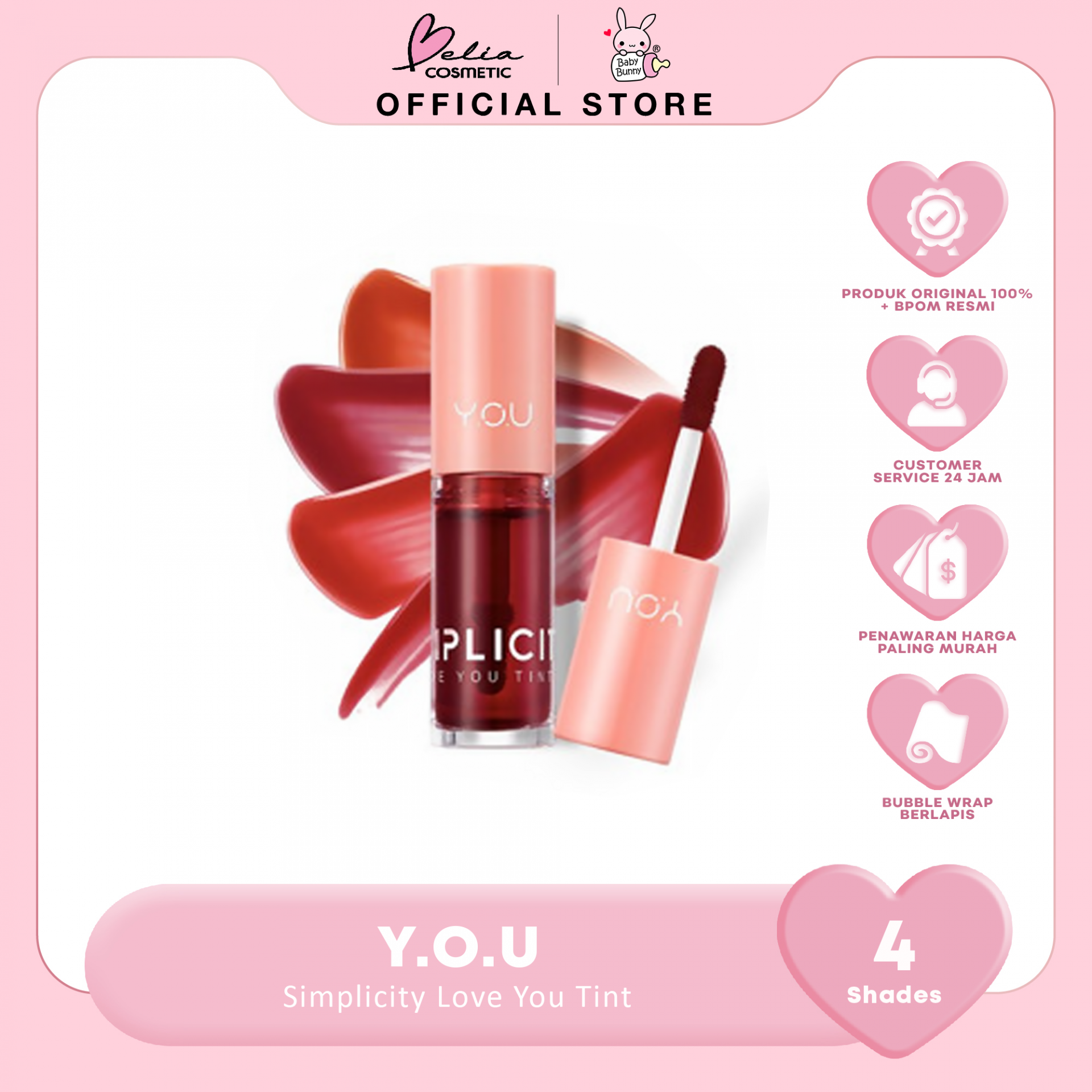 YOU Simplicity Love You Tint mengandung 4D Hyaluronic Acid dan Ekstrak Blueberry yang memberikan hasil natural dengan sensasi ringan dan tahan lama.