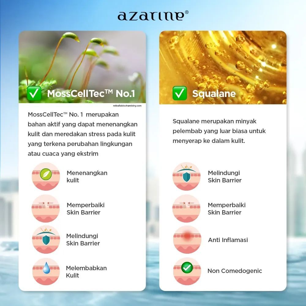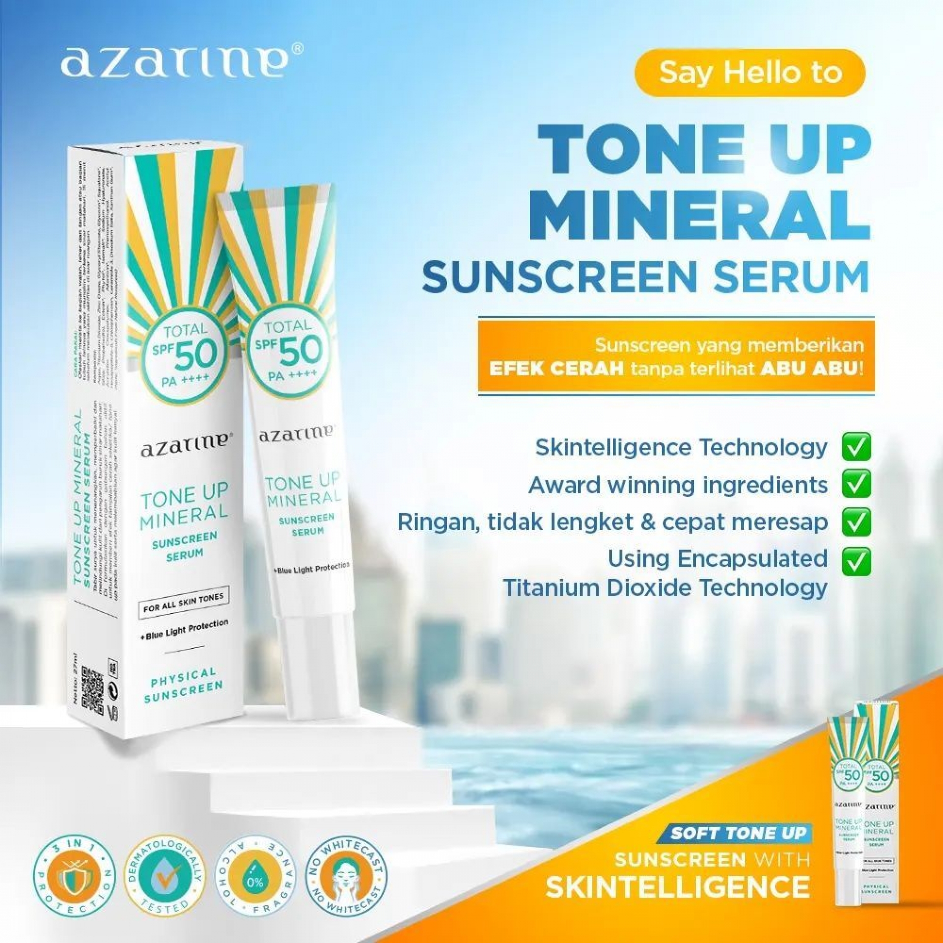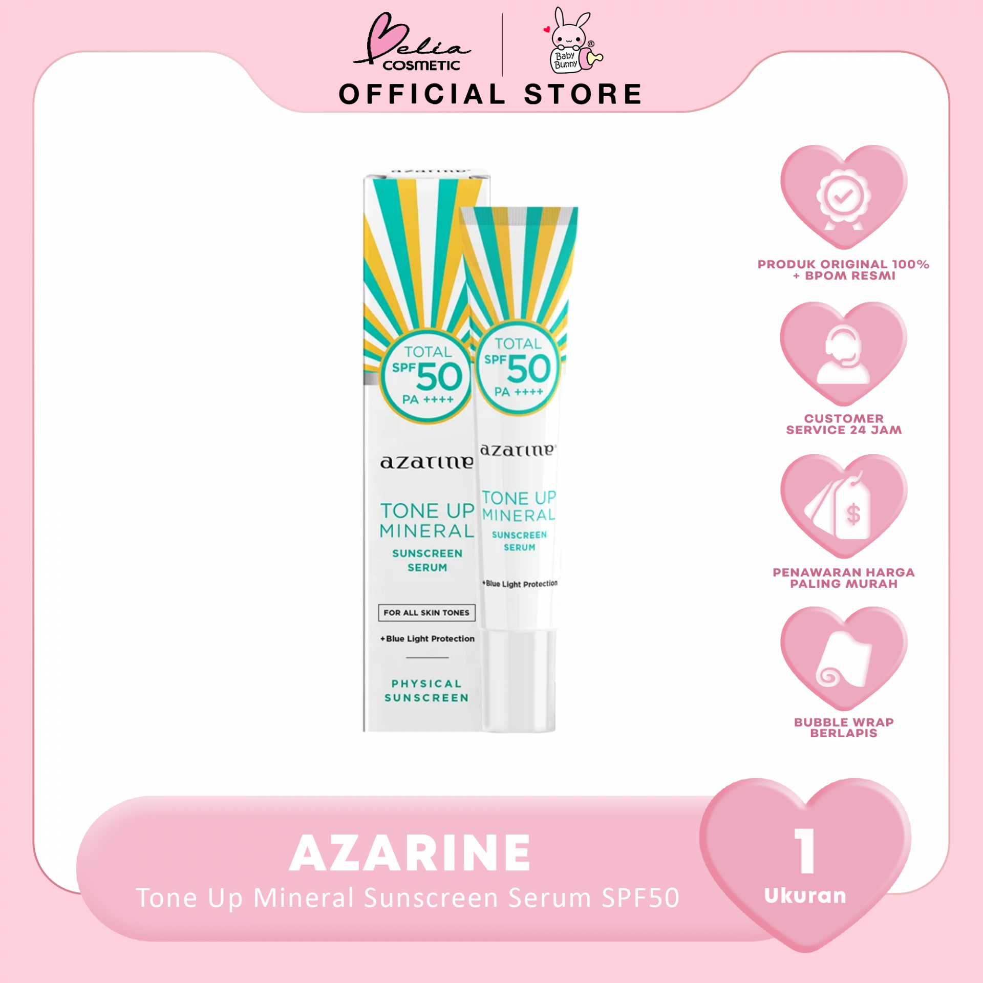 Tabir surya/ mineral sunscreen untuk menenangkan, memperbaiki dan melindungi kulit dari pengaruh buruk sinar matahari, sinar blue light dan polusi. Di formulasikan dengan gabungan bahan aktif untuk memberikan efek tampilan cerah / tone up pada kulit serta melembabkan agar kulit tetap kenyal.Cocok untuk kulit sensitif, kering, normal dan kombinasi.