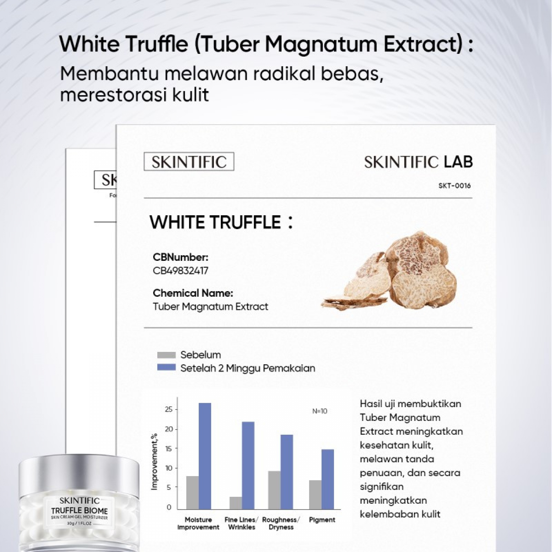 White Truffle ekstrak yang dikombinasikan dengan Probiotic Complex dalam bentuk pearl, dibalut dengan 5X Ceramide gel dengan Wrapping Tech Technology untuk menjaga mikrobiome kulit tetap sehat. Dengan tekstur yang unik, kombinasi tekstur gel dan cream, memberikan kelembaban lebih pada kulit, tanpa rasa lengket dan menghaluskan tekstur kulit. Cream Gel ini dengan cepat dan intensif dalam memperbaiki kulit dari kemerahan, kering dan iritasi sekaligus mengurangi breakout. Secara efektif menyeimbangkan mikroflora kulit untuk perbaikan kulit secara alami sekaligus menghidrasi dan melembabkan dan menjaga skin barrier. White Truffle sebagai jamur langka dengan kualitas tinggi dari Alba yang kaya akan asam lemak untuk mendukung skin barrier, Peptides sebagai anti-aging, serta Vitamin C untuk mendorong kulit bercahaya, melawan radikal bebas dan menjadikan kulit kenyal.