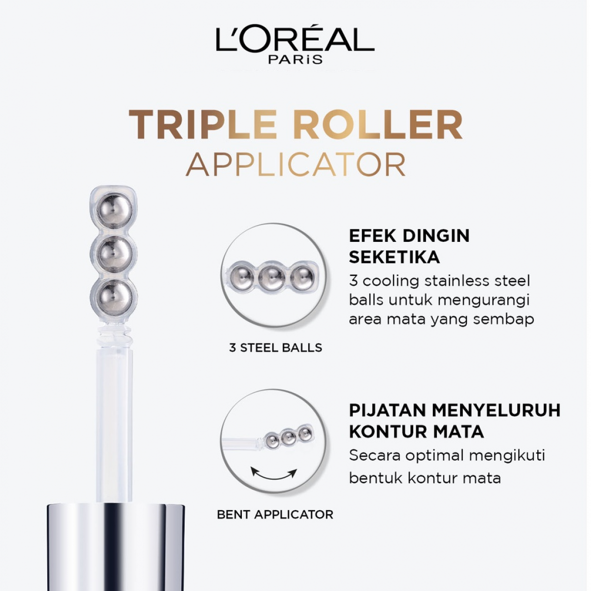 -Aplikator Triple Roller yang dipatenkan terbuat dari 3 Stainless Steel Cooling Balls yang dapat ditekuk secara optimal untuk memberikan pijatan pada area mata untuk membantu proses penyerapan bahan aktif, mengasilkan hasil yang efektif.